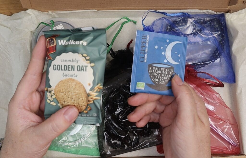 Every box has something else in it! Some would say the bet part ๐ I forgot the Tea and Biscuits the Relax part of every box. I choose only the best quality biscuits and tea and of course I have sampled each flavour (well I have to make sure that they are lovely don’t I lol)
